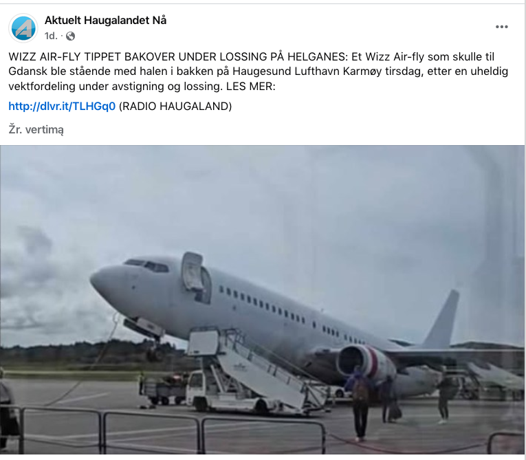 Norvegijos Haugesundo oro uoste užfiksuotas nestandartinis incidentas, kuris vos nesibaigė rimta nelaime. Skrydį Gdanskas–Haugesundas vykdęs iš Lietuvos kilusios užsakomųjų skrydžių bendrovės „GetJet Airlines“ orlaivis, nuomotas „Wizz Air“, po nusileidimo netikėtai atsistojo „piestu“ – jo priekis pakilo į orą, o uodega trenkėsi į žemę.