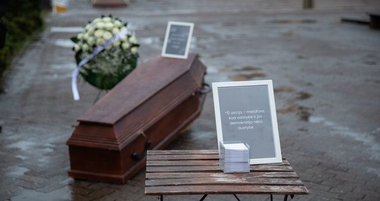 Akcijų organizatoriai į Nepriklausomybės aikštę atnešė karstą, aplink kurį buvo išdėlioti laidotuvių vainikai, degamos žvakutės. Ant karsto taip pat padėtas portretas su užrašu „Valstybė, kuri veikia“.